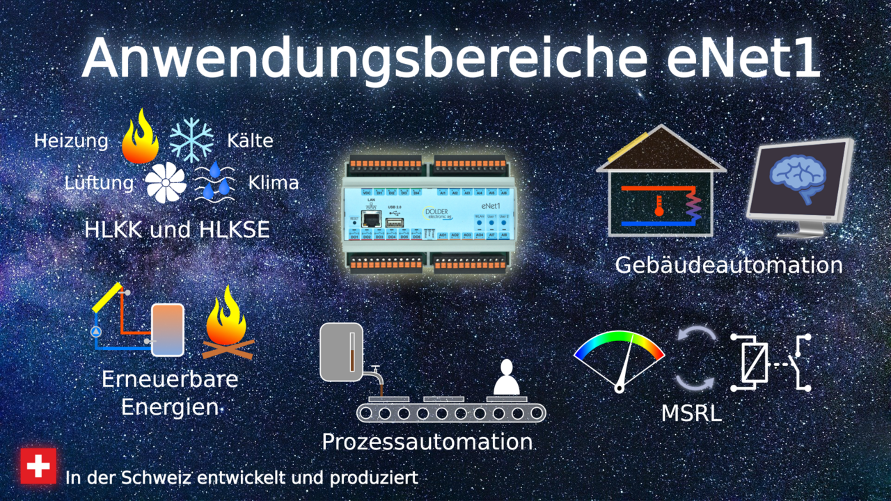 Die Möglichkeiten des neuen Universalreglers eNet1 sind gross und die Anwendungen vielfältig: von der Rückgewinnung von Abwärme über Datenlogger-Aufgaben zur Analyse von Systemen bis zur Ergänzung eines Gebäude-Automationssystems um weitere Ein- und Ausgänge per Modbus/TCP, von der Heizungssteuerung mit Fernzugriff über die Regelung thermischer Solaranlagen bis zum Energie-Erzeuger-Management ist alles möglich.