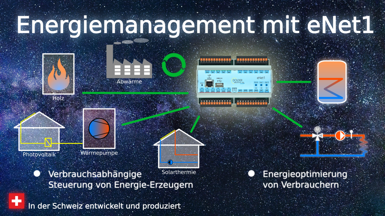 Die Möglichkeiten des neuen Universalreglers eNet1 sind gross und die Anwendungen vielfältig: von der Rückgewinnung von Abwärme über Datenlogger-Aufgaben zur Analyse von Systemen bis zur Ergänzung eines Gebäude-Automationssystems um weitere Ein- und Ausgänge per Modbus/TCP, von der Heizungssteuerung mit Fernzugriff über die Regelung thermischer Solaranlagen bis zum Energie-Erzeuger-Management ist alles möglich.