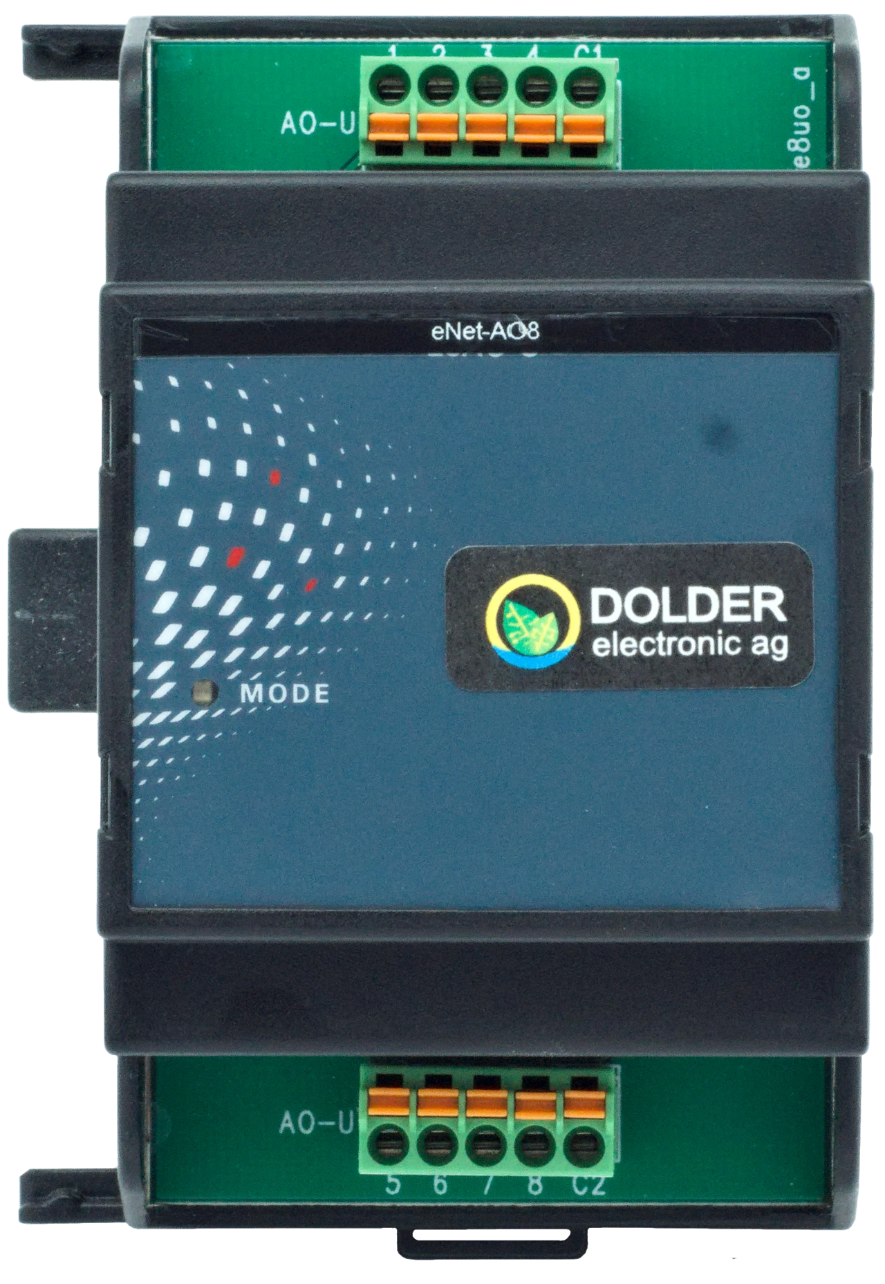 Das Erweiterungsmodul eNet-AO8 wird einfach am Basismodul eNet-IOBS angesteckt. Die 8 Analogausgänge (0-10VDC) können dann per Modbus/TCP geschrieben werden. Der Universalregler eNet1 verfügt dazu über eine Modbus-Client-Funktion, mit Hilfe derer reglerinterne, analoge Signale an die entsprechenden Adressen des Erweiterungsmoduls geschrieben und so die Ausgänge gesetzt werden können. Das zyklische Update der Ausgangswerte erfolgt in einem einstellbaren Intervall.