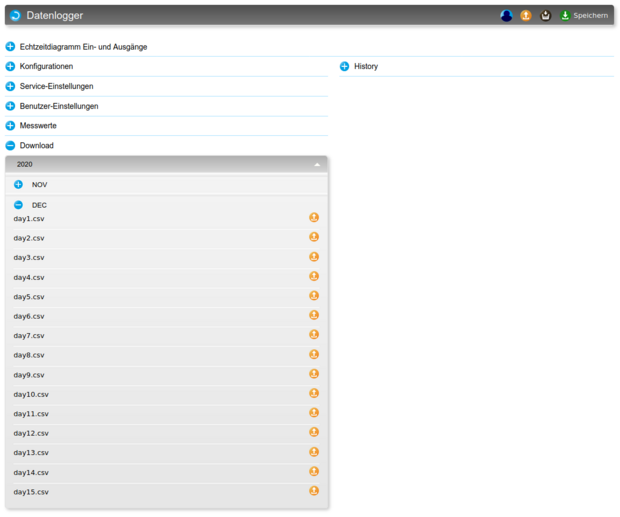 Der eNet1 verfügt über einen integrierten Mehrkanal-Datenlogger. Dieser ist ideal, um z.B. Temperaturen, Feuchtigkeitswerte oder andere Sensordaten aufzuzeichnen. Dabei werden in einem einstellbaren Intervall (min. 1s) alle Ein- und Ausgänge sowie reglerinterne Signale mit einem Datums und Uhrzeitstempel aufgezeichnet. D.h. es werden 8 analoge Eingänge, 4 analoge Ausgangszustände, 64 analoge Signale (z.B. Daten, welche per Modbus/TCP-Client von Erweiterungsmodulen erfasst werden), 4 digitale Logik- oder Zähler-Eingänge, 6 digitale Signale von den Benutzer-Tasten des eNet1, 64 digitale Signale (z.B. von Modbus/TCP-Erweiterungsmodulen) und 6 digitale Ausgangszustände gelogged.